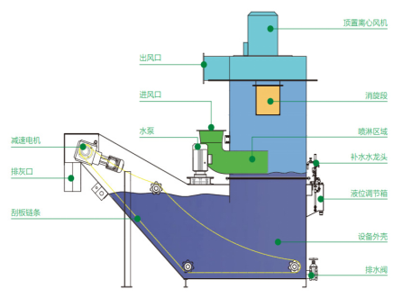 除塵系統運行中,收集罩把粉塵產生源將煙塵/粉塵捕集起來,通過管道系統輸送到分離器的進風口,之后進入噴淋區域,在最近的位置通過氣